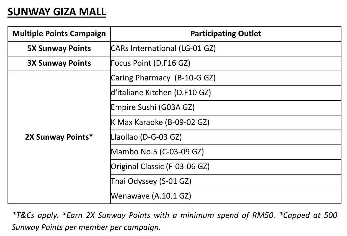 The 2X Sunway Points* reward is applicable only with a minimum spend of RM50, and capped at a maximum of 500 Sunway Points awarded to each member throughout the entire campaign or conclude once in total reaches 2,500,000 Sunway Points, whichever comes first.